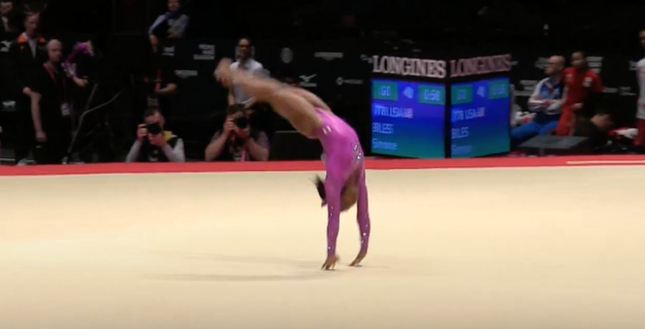 Have a look at Simone Biles’s floor routine performance at the 2015 World Artistic Gymnastics Championships in Glasgow.